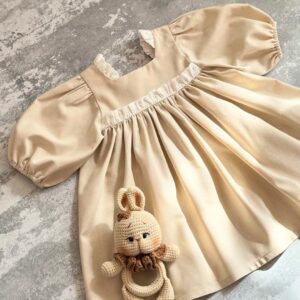 The dress features soft, adjustable tie-up shoulder straps and a button-down front for easy dressing, while the gathered waist and flared hem create a playful, breezy silhouette. Designed for comfort and charm, it’s perfect for sunny days and special moments alike. The natural texture of the cotton fabric ensures breathability, making it gentle on delicate skin.