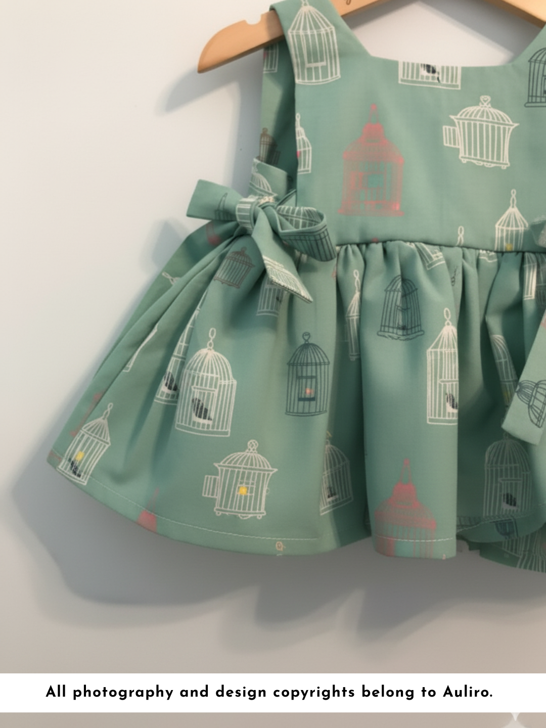 Description: Gather whimsical charm for your little one with the “Bird Flocks” Dress. This enchanting dress features a playful pattern of delicate birdcages, rendered in crisp white and soft pinks, beautifully contrasted against a serene teal-green cotton fabric. The soft, breathable material and comfortable square neckline make it an ideal choice for sunny days and joyful outings. With sweet bow accents on the shoulders and a charming gathered skirt perfect for twirling, it’s designed for cool comfort and effortless style—perfect for park visits, playdates, and all-day smiles.