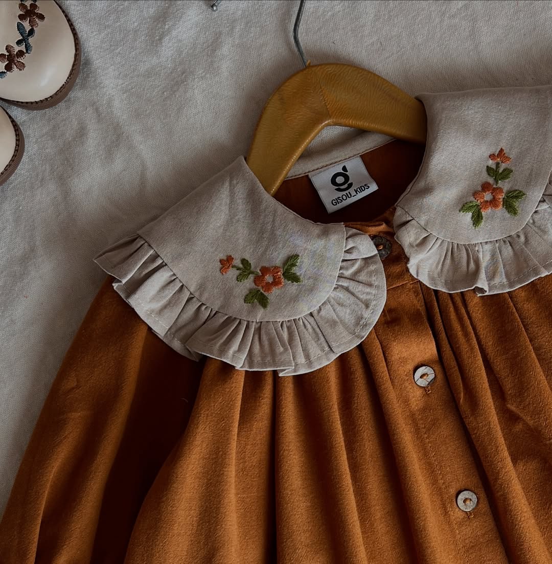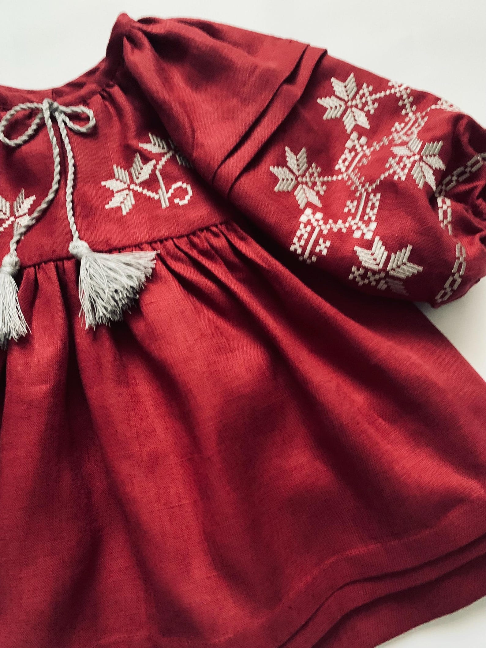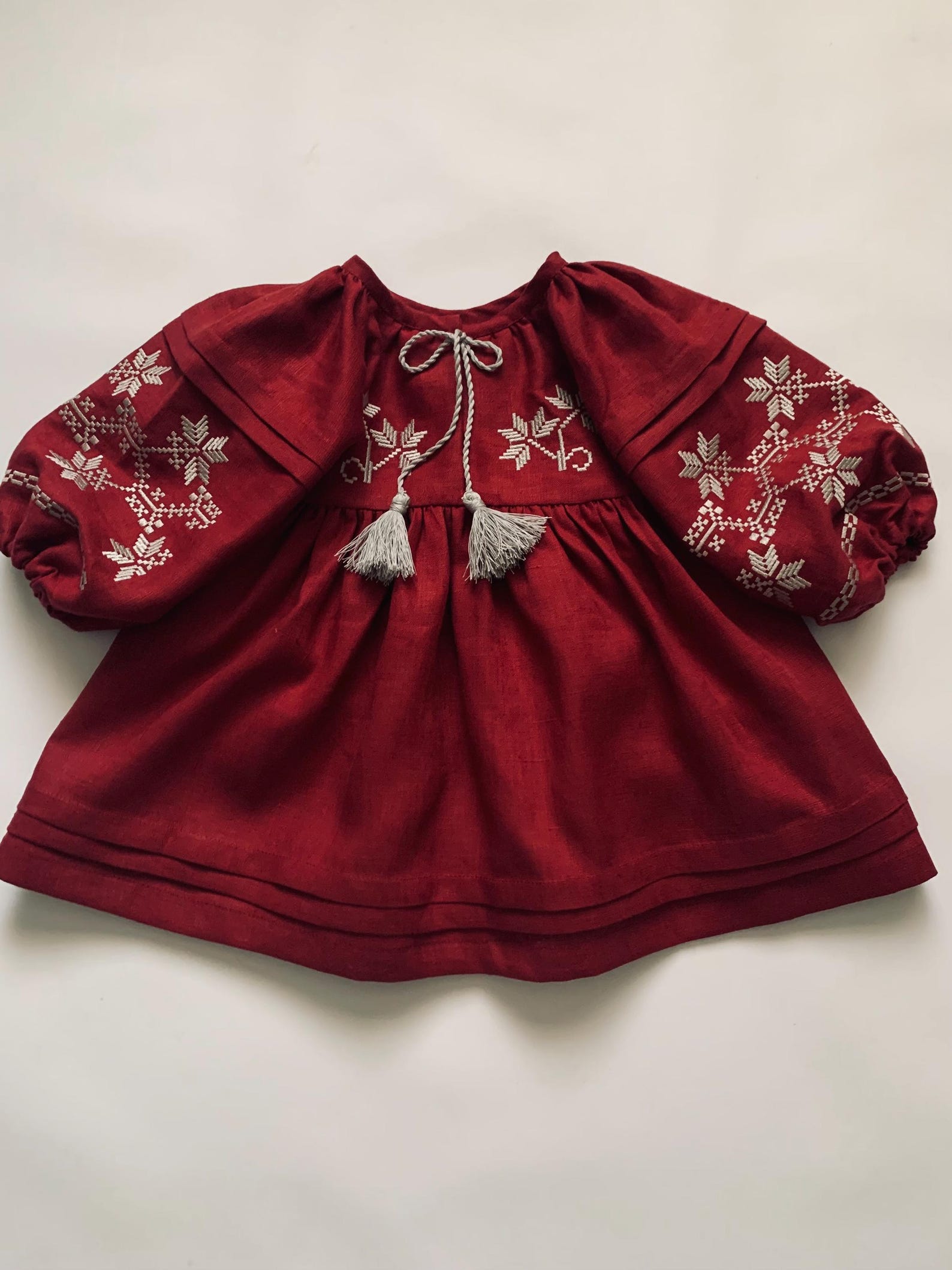 This is a beautiful maroon kurta adorned with intricate embroidery. The embroidery features delicate geometric and floral patterns in contrasting golden or cream threadwork, giving it an elegant and traditional touch. The neckline is accentuated with scalloped lace detailing, adding to the overall charm.