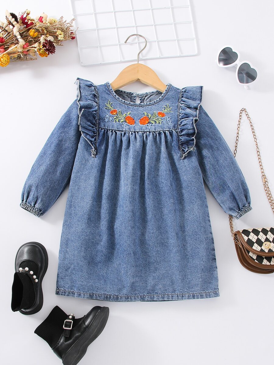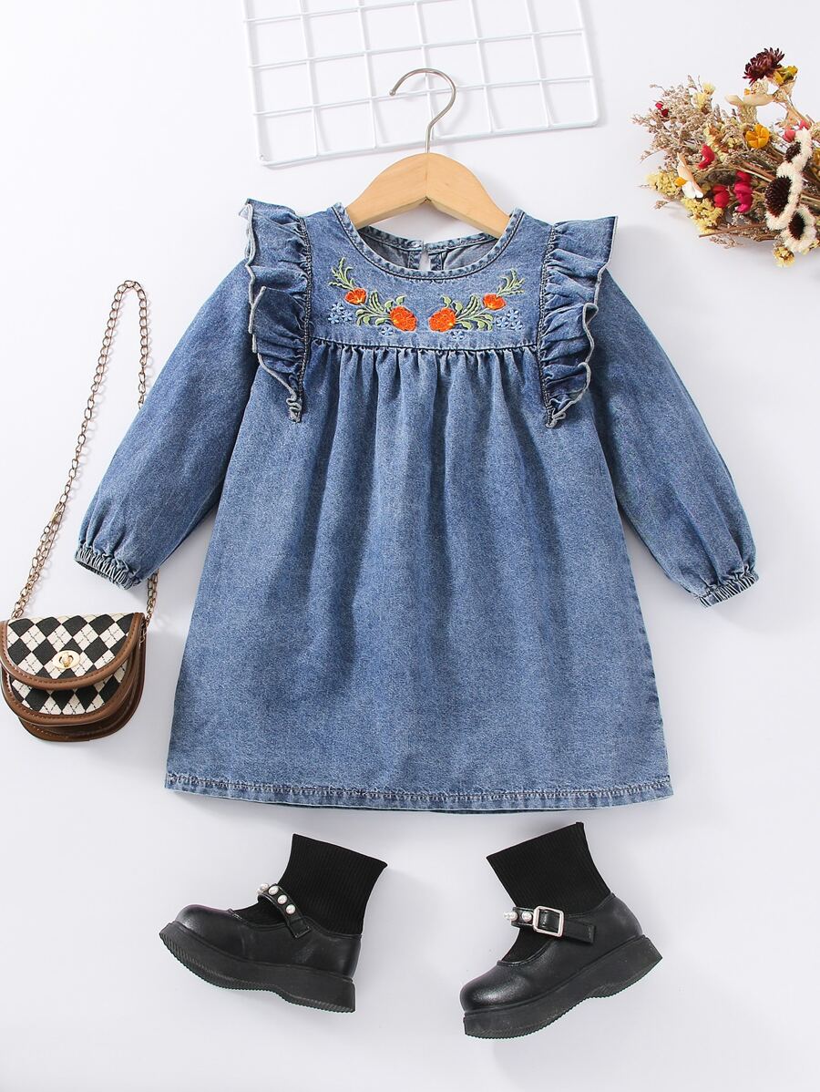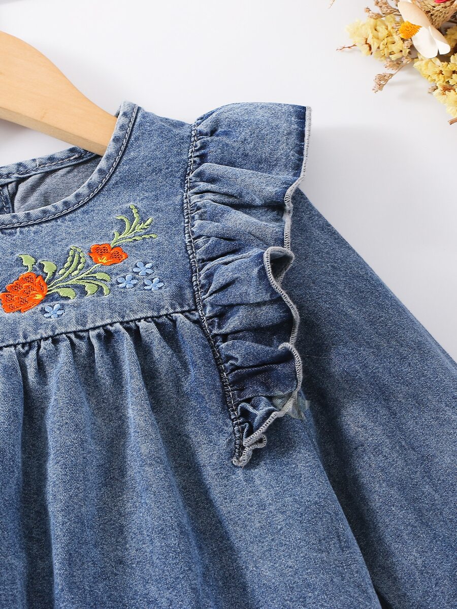 Skip to contentA delightful soft denim dress for toddlers and young girls, featuring vibrant floral embroidery on the chest with orange blooms and green vines. The dress features a relaxed, flowy silhouette, complete with charming ruffle details along the shoulders, a simple round neckline, and long sleeves with comfortable elastic cuffs. The hemline is finished with durable stitching, making it perfect for both playtime and parties.