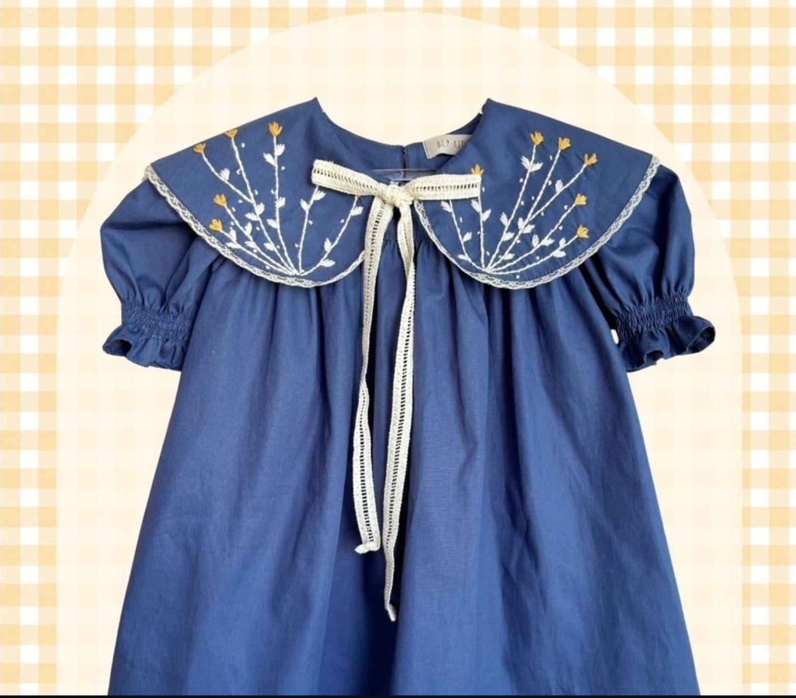 Skip to contentLet your little one bloom in this beautifully crafted navy blue dress, made from 100% pure cotton for the softest and most breathable comfort. Designed with charming puffed sleeves, a gathered skirt, and a wide embroidered collar finished with delicate lace trim and a front tie ribbon — this piece captures timeless elegance in every stitch.