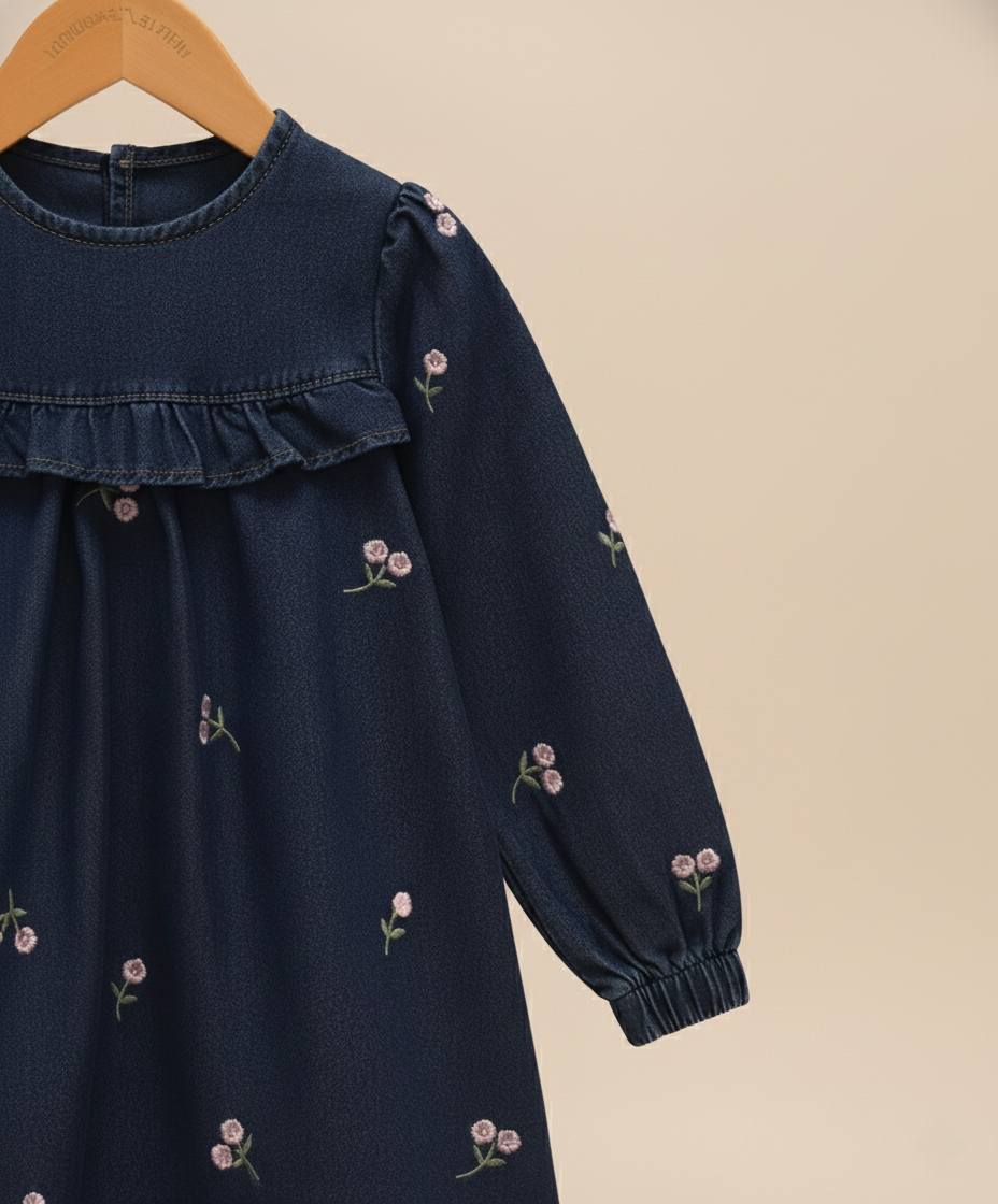 Made from soft, breathable denim fabric, this long-sleeve frock features delicate hand-embroidered pink flower patterns, a ruffle neckline, and elastic cuffs for a snug yet airy fit. The beautiful dark-navy tone makes it suitable for any season — ideal for both summer outings and winter layering.