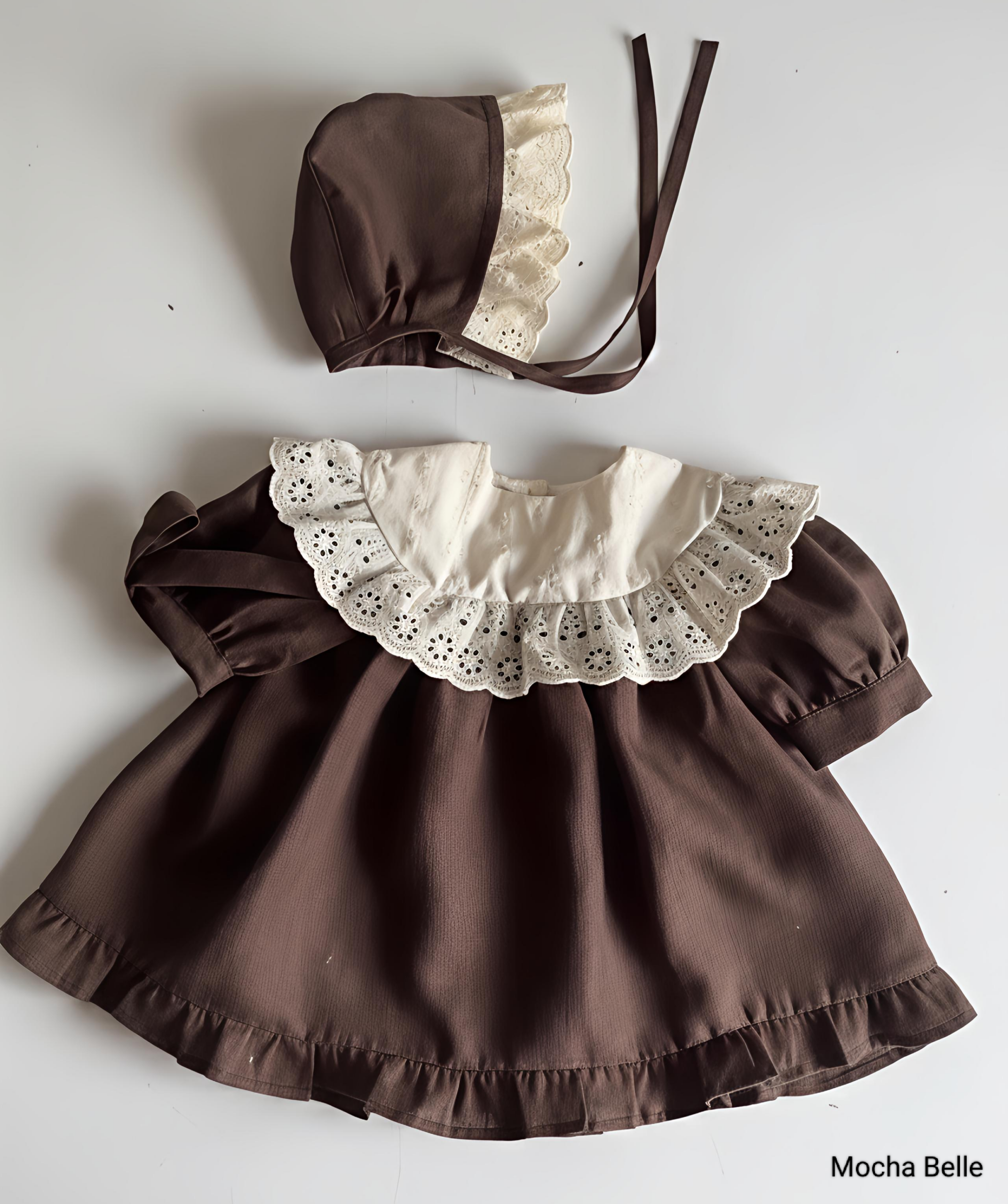 Mocha Belle is a timeless vintage-inspired baby dress crafted from soft, breathable photo fabric, designed especially for little ones from newborn to 7 years. The rich mocha tone paired with delicate ivory lace detailing creates an elegant, old-soul charm—perfect for everyday sweetness and special moments alike.