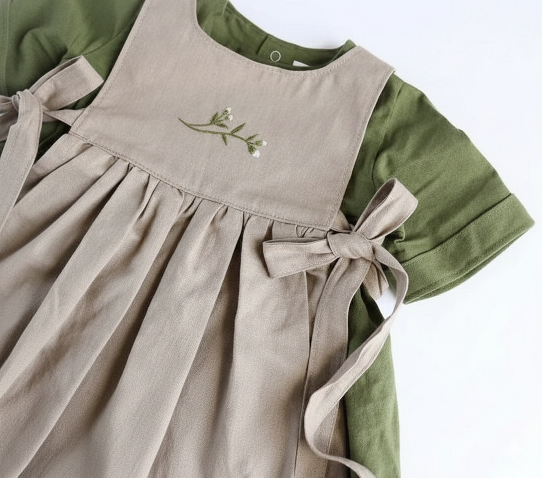 Wrap your little one in the buttery softness of our Tencel-Cotton blend pinafore set, designed for ultimate breathability and eco-friendly comfort. This enchanting duo features a moss green base dress paired with a neutral sand apron, complete with delicate floral embroidery and whimsical side-tie bows. It’s a timeless, woodland-inspired look that’s as gentle on the planet as it is on her skin.