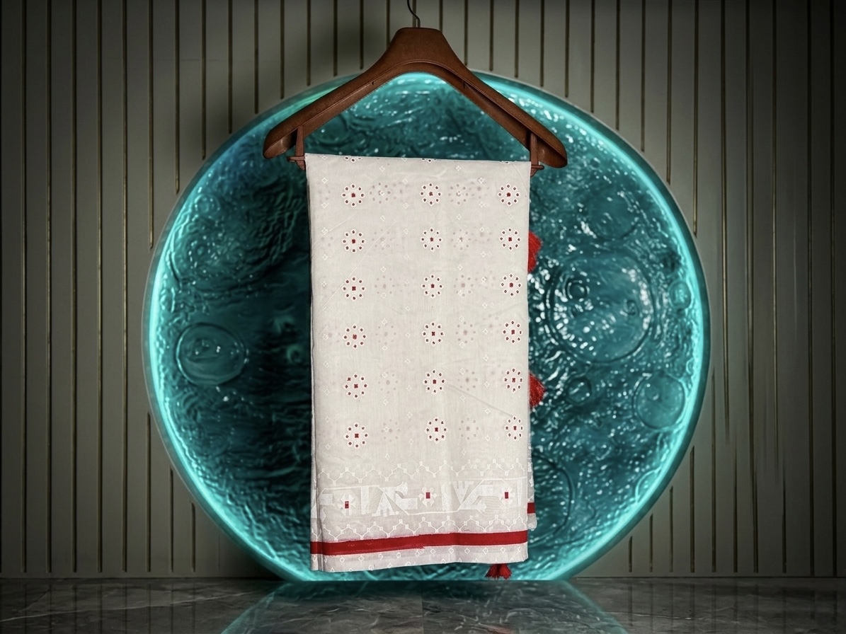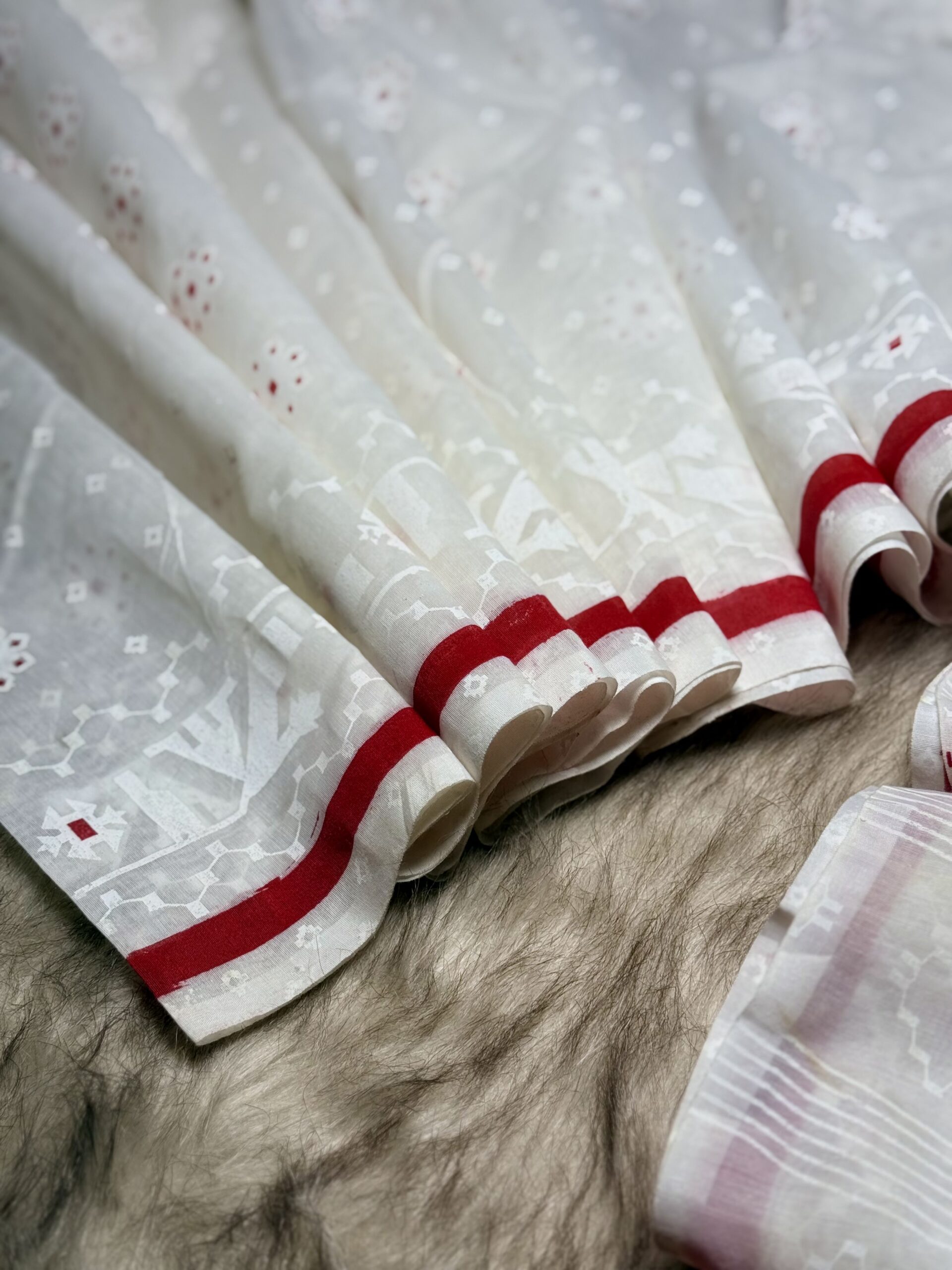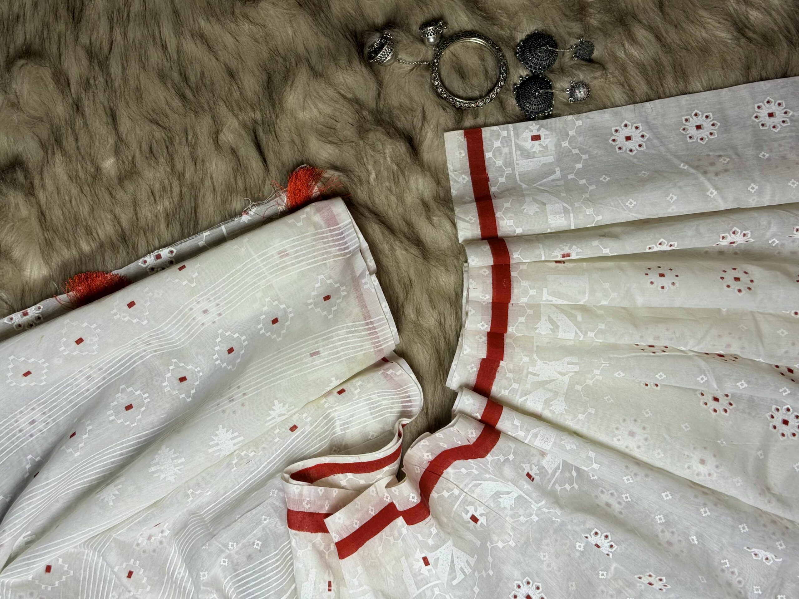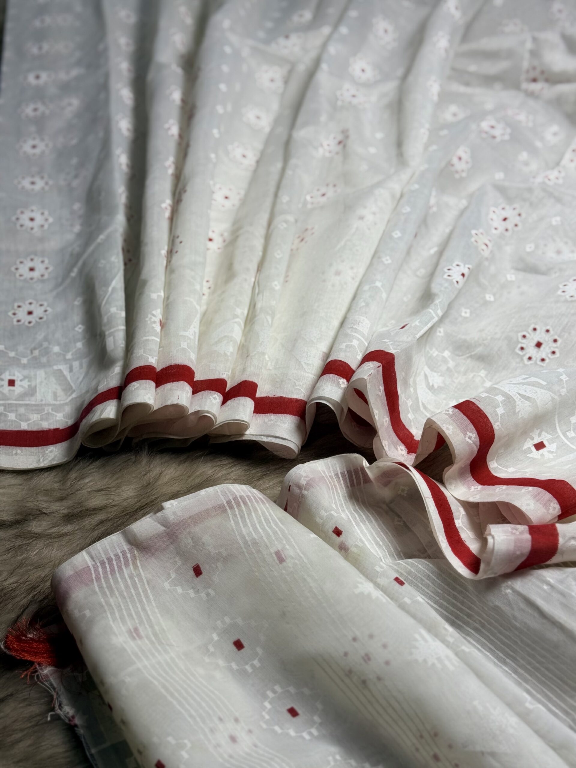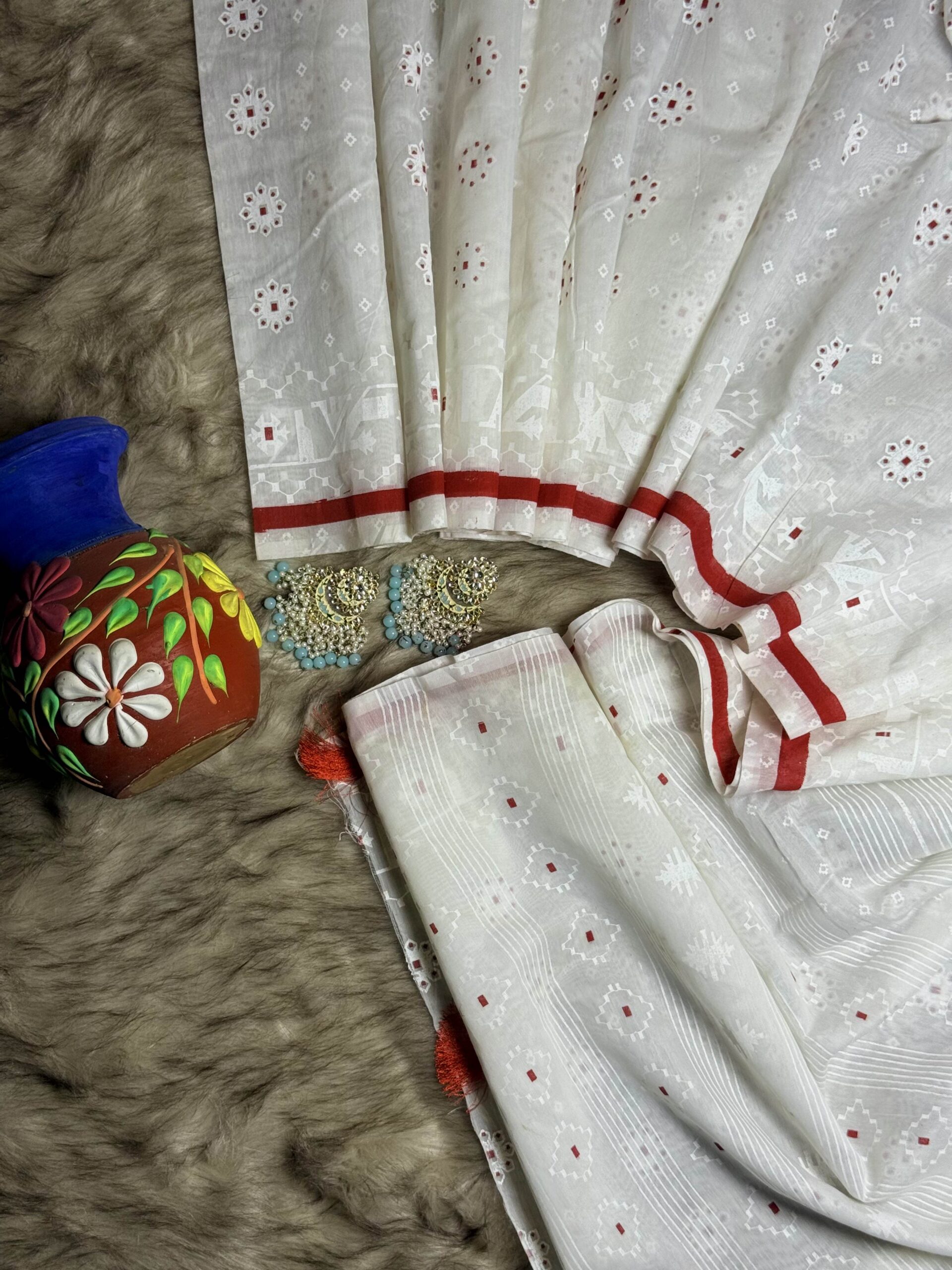 Celebrate the spirit of Noboborsho with grace, tradition, and effortless beauty. This stunning saree blends purity and festivity with its classic white base and bold red border — a perfect symbol of new beginnings.