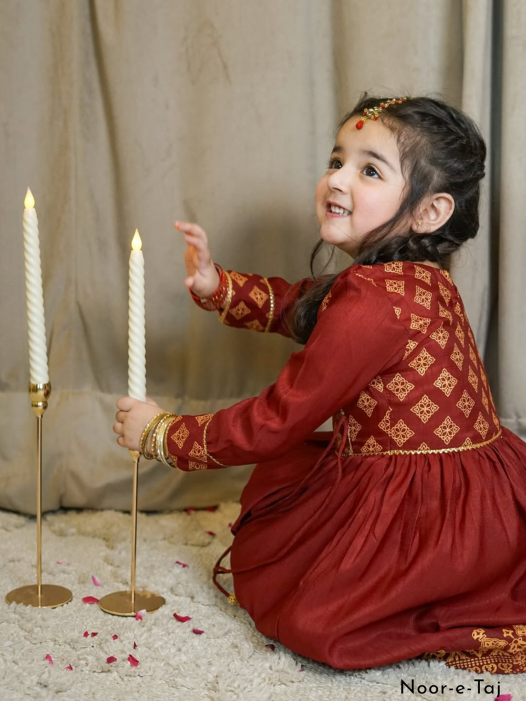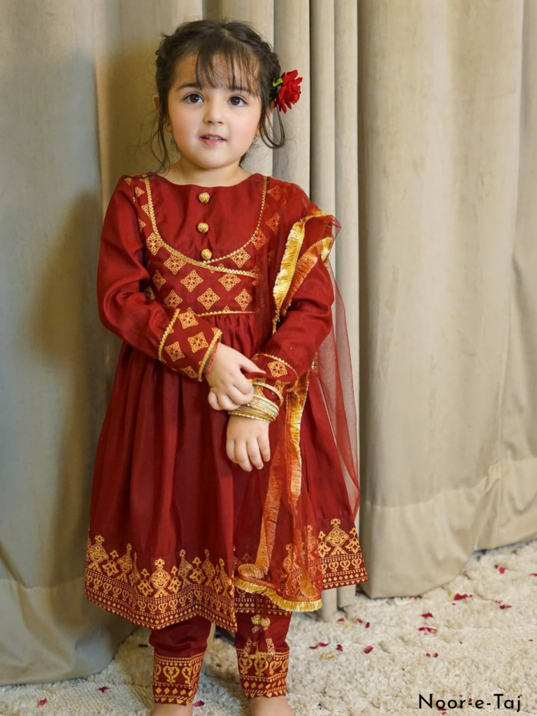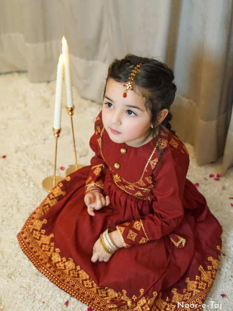 Made from soft, breathable cotton, Noor-e-Taj ensures all-day comfort while keeping your child effortlessly stylish. The finely detailed bodice, delicate golden buttons, and flowing silhouette create a regal look that shines beautifully in every memorable moment.