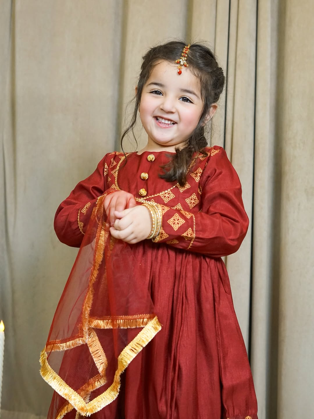 Paired with matching bottoms and a lightweight dupatta, this outfit is perfect for Eid, weddings, festive gatherings, family photoshoots, and special occasions. Gentle on young skin and easy to wear, it’s a piece parents trust and children love.