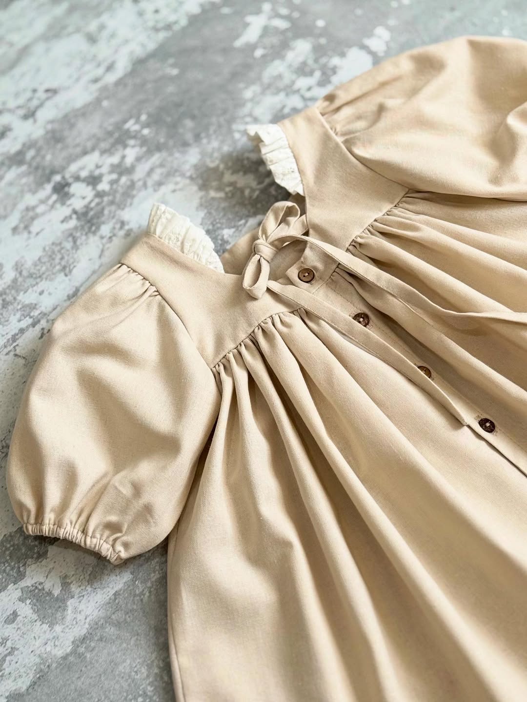 Skip to contentElevate her everyday wardrobe with this vintage-inspired cream dress. Crafted from 100% premium cotton, it features a charming ruffled collar, whimsical puffed sleeves, and a full row of natural wooden buttons down the back.